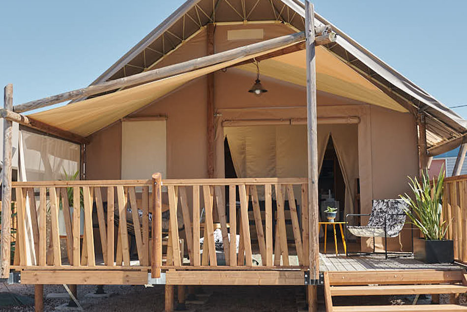 Camping Les 5 châteaux " Camping Bord de Dordogne " Nuestro insólito alojamiento " Tiendas de campaña " Tienda : LODGE Privilège | 4 personas | 2 habitaciones